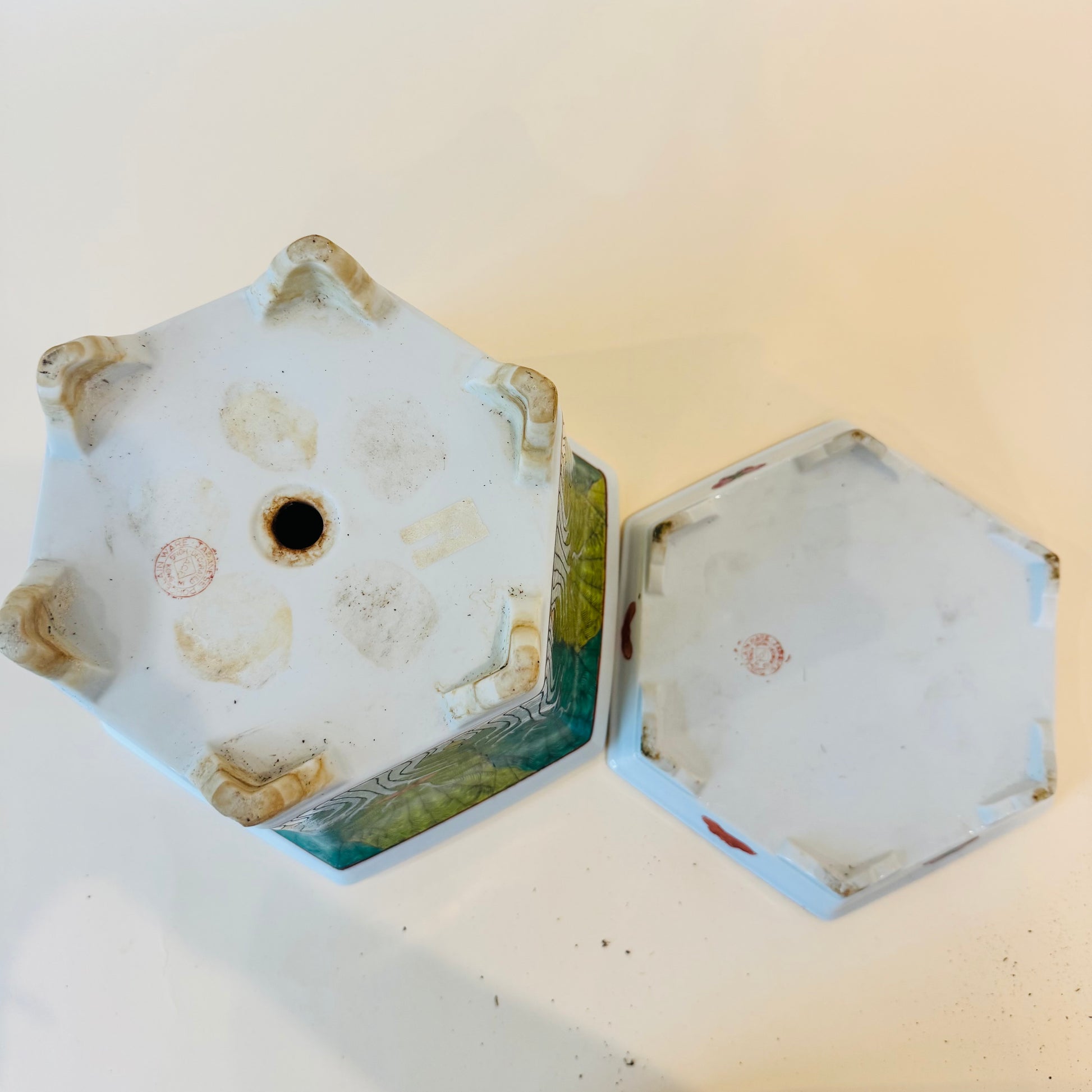 Bok Choy Porcelain Planter Japan Decorated in Hong Kong w/ Drip Tray 9x10