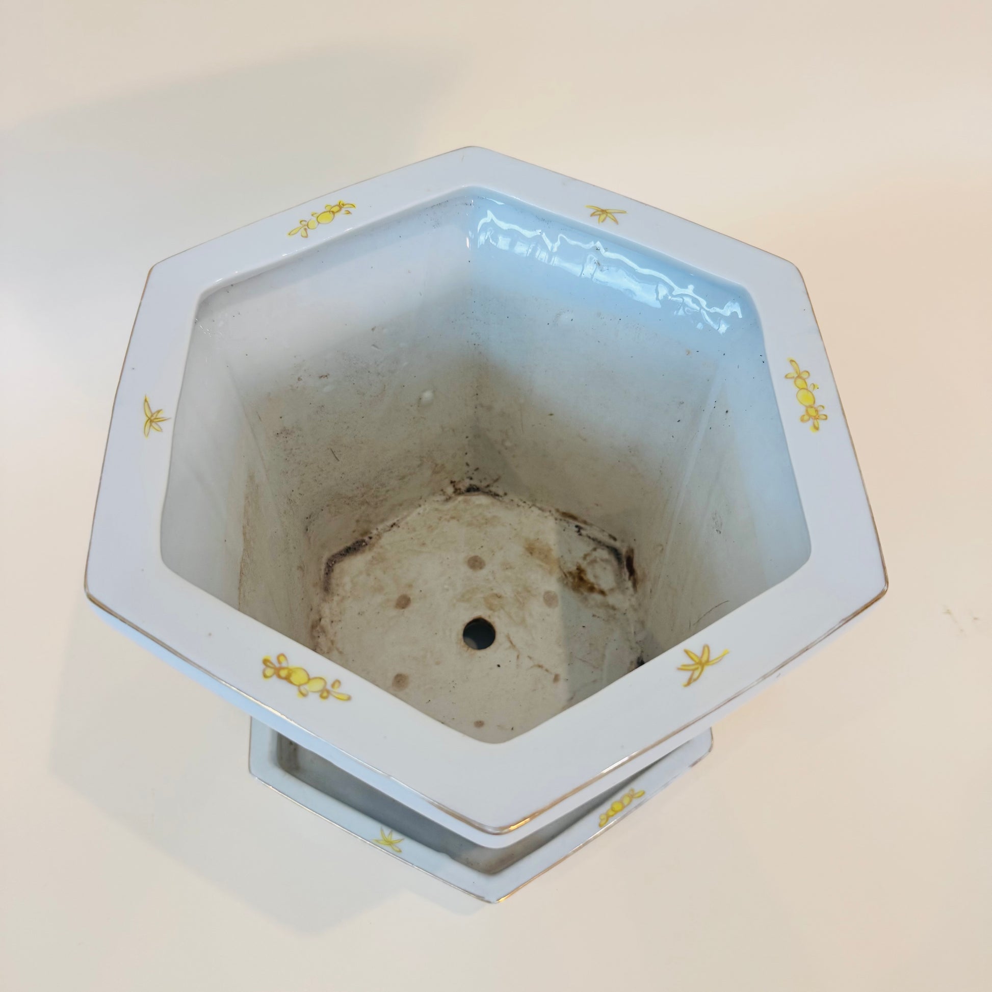 Elegant mid-century porcelain planter featuring hand-painted yellow floral and vine motifs on a white ground, accented with fine gilt trim. Stamped “Japanese Porcelain Ware – Decorated in Hong Kong”, this piece represents postwar export craftsmanship from the 1950s–1970s. Includes a matching drip tray and drainage hole — perfect for both display and practical use.