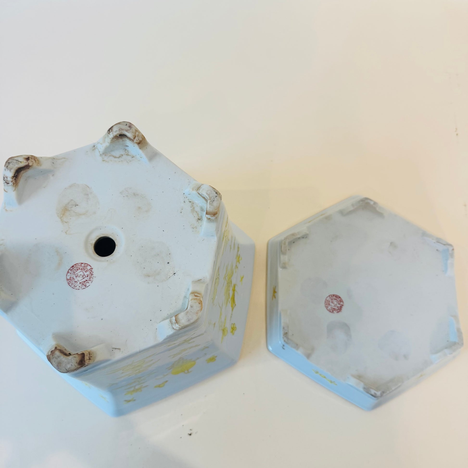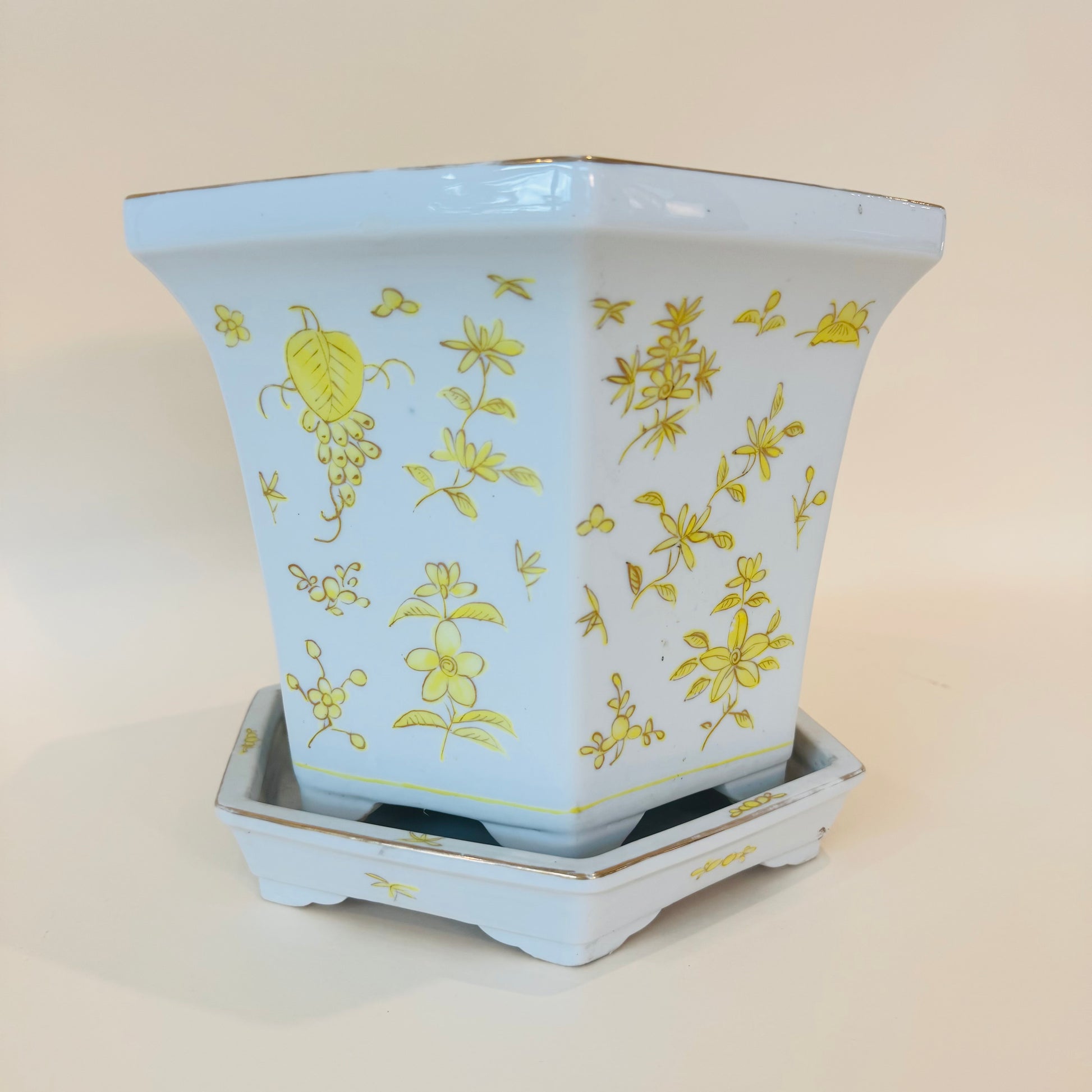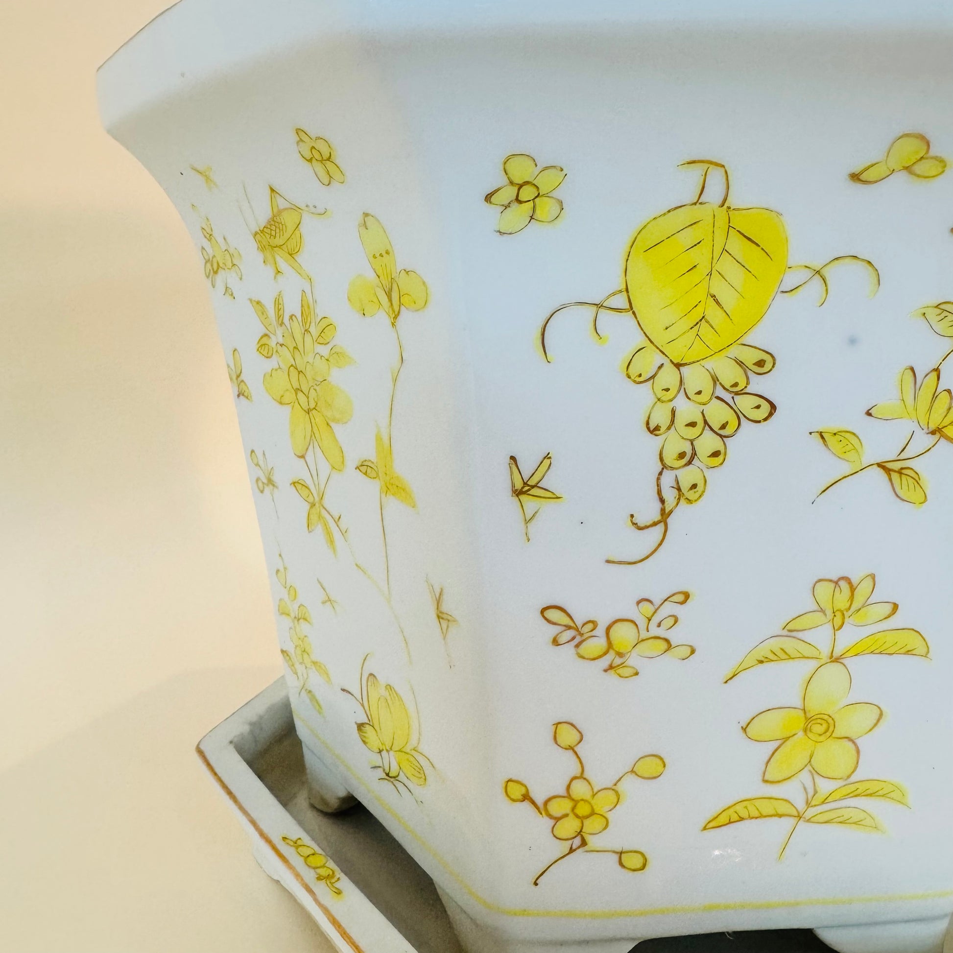 Yellow Floral Porcelain Planter Japan Decorated in Hong Kong w/ Drip Tray 9x10