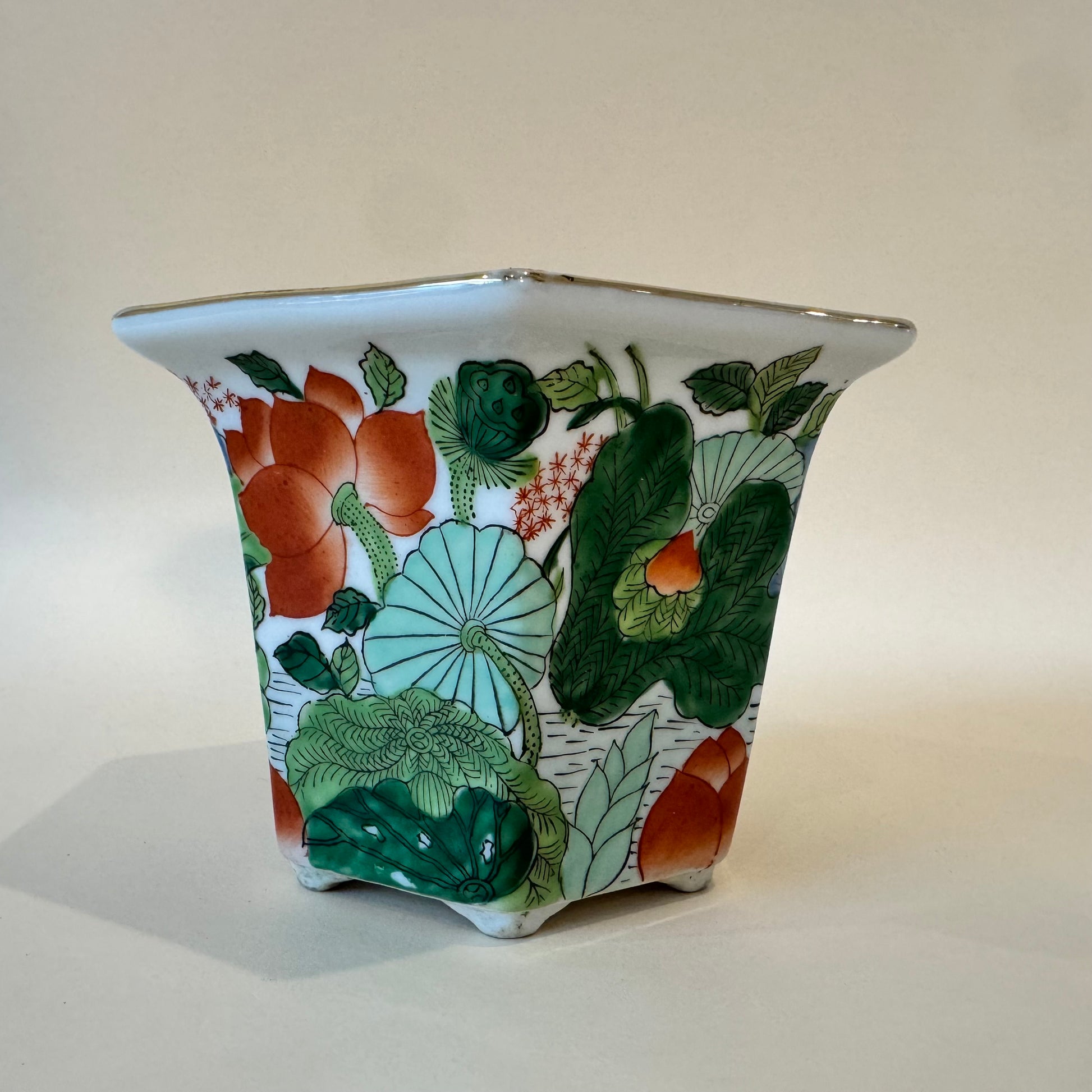 Charming vintage porcelain planter hand-painted with vivid lotus flowers and green foliage in the famille verte palette. Finished with delicate gilt trim and red scroll accents along the rim. Though unmarked, the style and palette suggest mid-century Asian export craftsmanship.