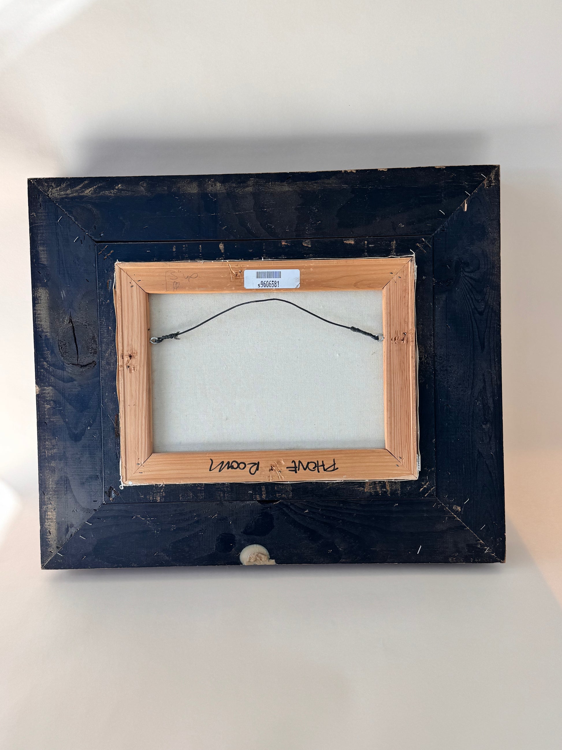 - Condition: Some paint loss visible; frame sturdy with minor chips; overall displays beautifully. Note: the words “phone room” are written in marker on the back stretcher bar, not visible when hung.