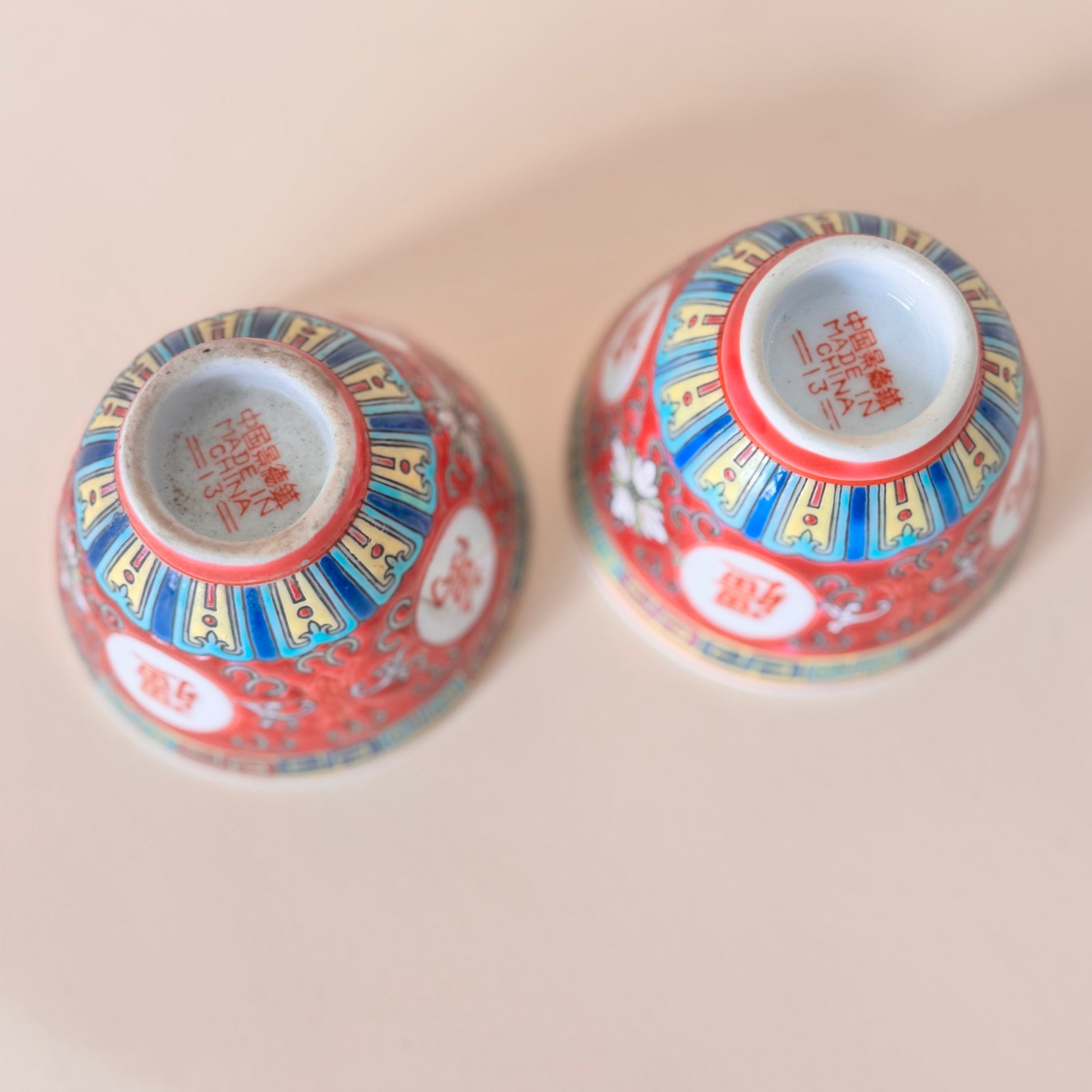 Pair of Vintage Wan Shou Wu Jiang Red Longevity Teacups
