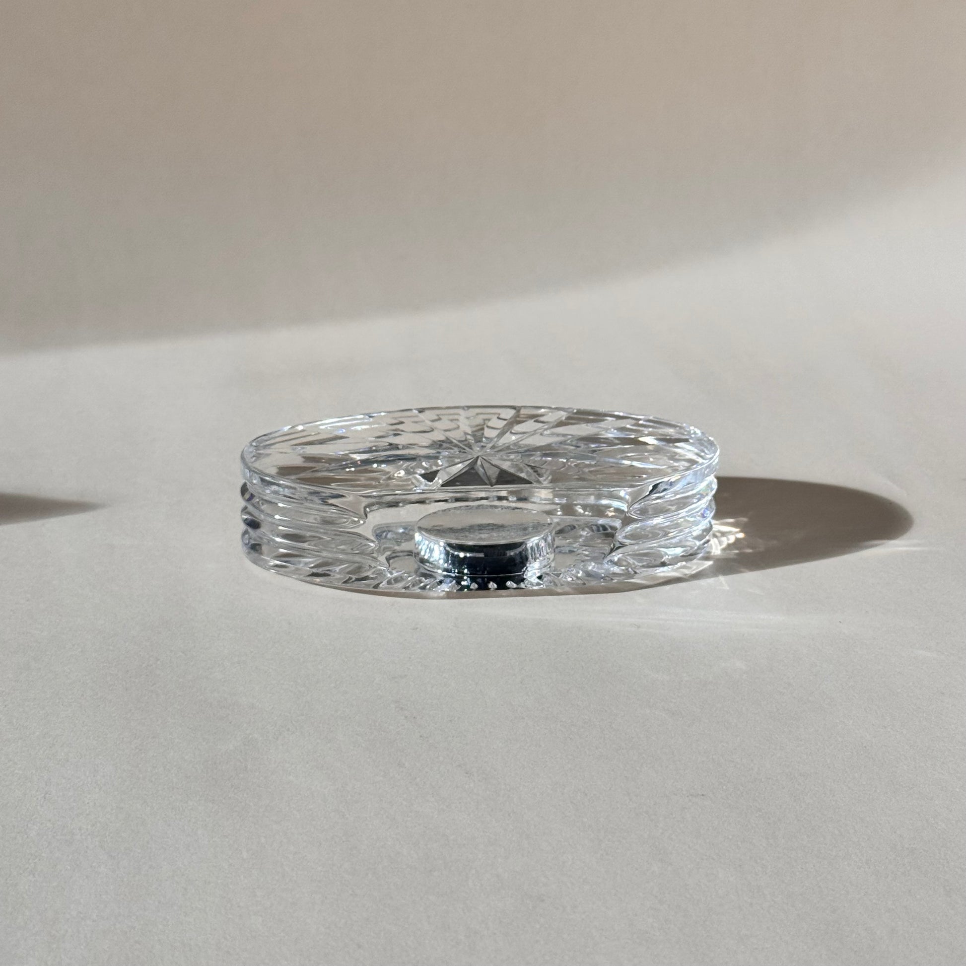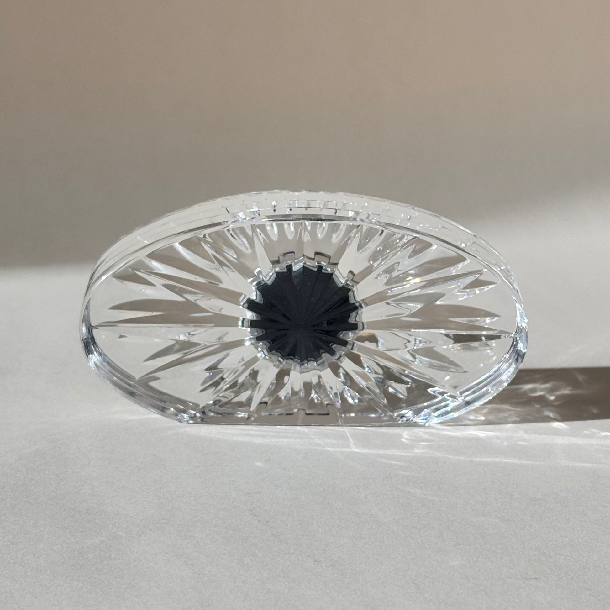 This vintage Waterford crystal desk clock features a round quartz movement set into finely cut lead crystal. Its oval shape and faceted design catch the light beautifully, making it both a practical timepiece and a decorative accent for a desk, shelf, or mantel.